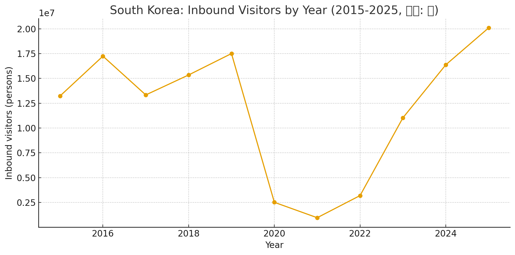 2015년 이후 방한 외국인 수는 꾸준히 증가하다가, 2020~2021년 팬데믹 충격으로 급락했다. 그러나 2022년부터 회복세가 두드러지며 2025년에는 2천만 명을 돌파했다. 위 그래프는 2015년부터 2024년까지의 공식 집계치와 2025년 추정치를 하나의 선 그래프로 표현한 것이다.
